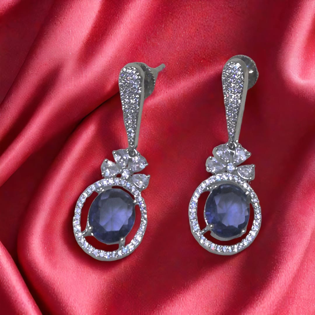 Enhance your everyday look with the stunning Amrita CZ Earrings, featuring a beautiful American diamond and an elegant blue stone. Perfect for every small occasion, these earrings are designed to last, making them an everlasting addition to your jewelry collection.