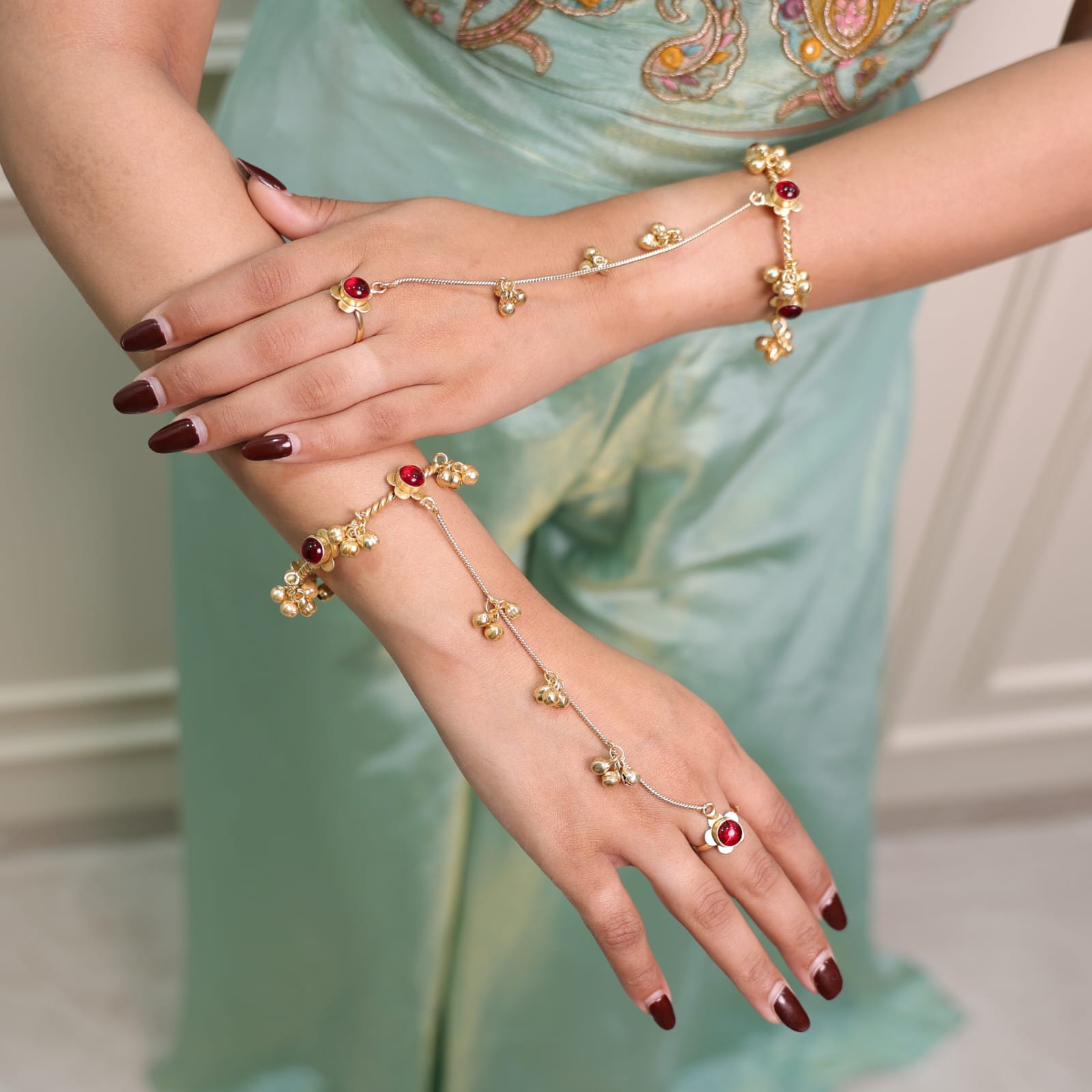 Elevate your traditional ensemble with this exquisite Chan-Chan Haathphool, a hand accessory that commands attention. The melodious tinkling of ghungroos creates an authentic celebratory resonance with every movement, infusing festive energy into your presence. Crafted to complement all traditional attire, this showstopper piece seamlessly transitions from weddings to festivals, adding both visual elegance and rhythmic charm to your calutral celebration.
