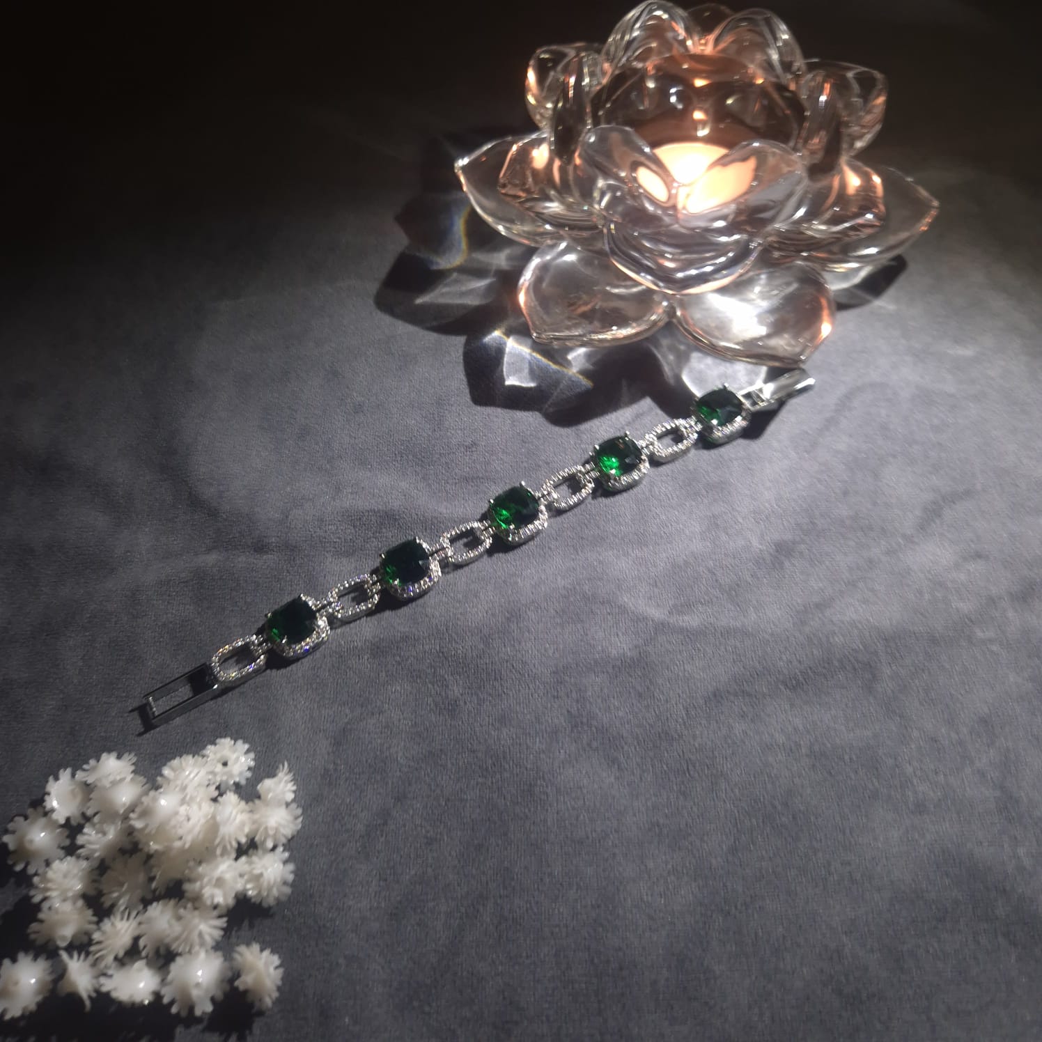 Expertly crafted, this stunning Emerald green CZ Bracelet is designed to resemble a real diamond bracelet. The rich green hue of the stone adds a touch of elegance to any occasion. With a luxurious feel, this bracelet is perfect for any event and will make you stand out.