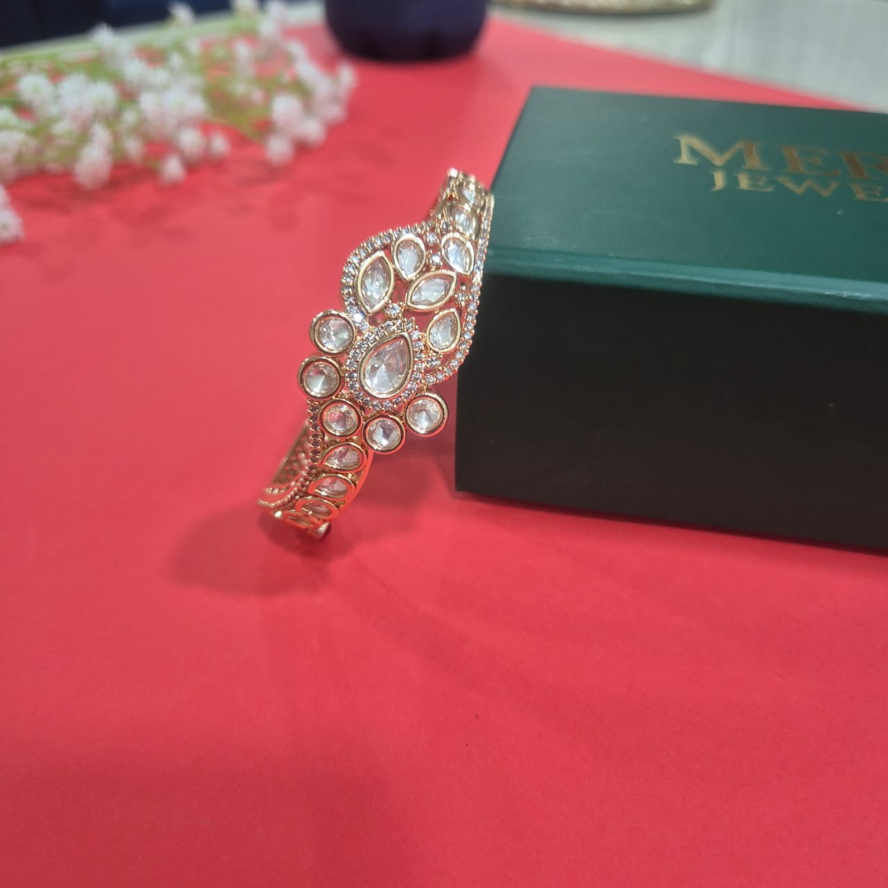 Experience elegance with the KASHISH MOISSANITE BRACLET. Made with real moissanite stones, luxurious gold polish, and CZ stones, this bracelet exudes a royal and sophisticated look that is sure to elevate any outfit. The perfect blend of traditional and contemporary design, it is a must-have for any fashionable individual. Dimensions Width: 1 inch, Weight: 26.70 g