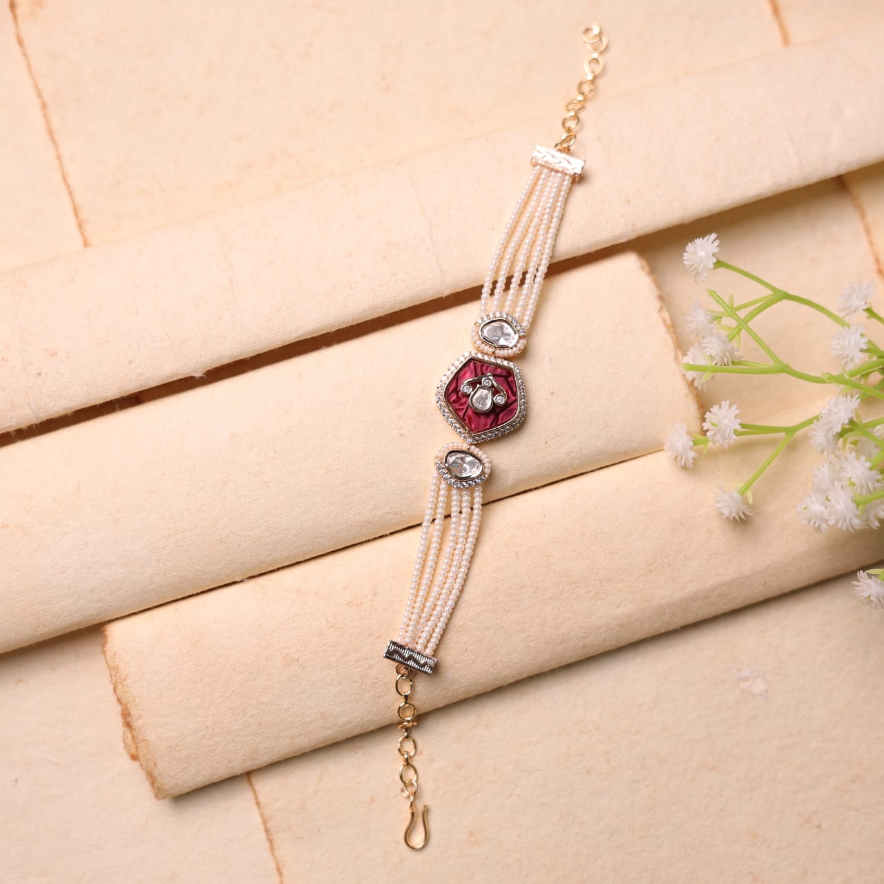 The Mitali Bracelet (Red) showcases a stunning Red mother-of-pearl centerpiece complemented by exquisite moissanite accents and delicate pearls on either side. This elegant combination enhances traditional attire with a refined sparkle and timeless charm, making it an ideal accessory for sophisticated occasions. Crafted to elevate your ensemble, this bracelet offers both grace and expert craftsmanship.