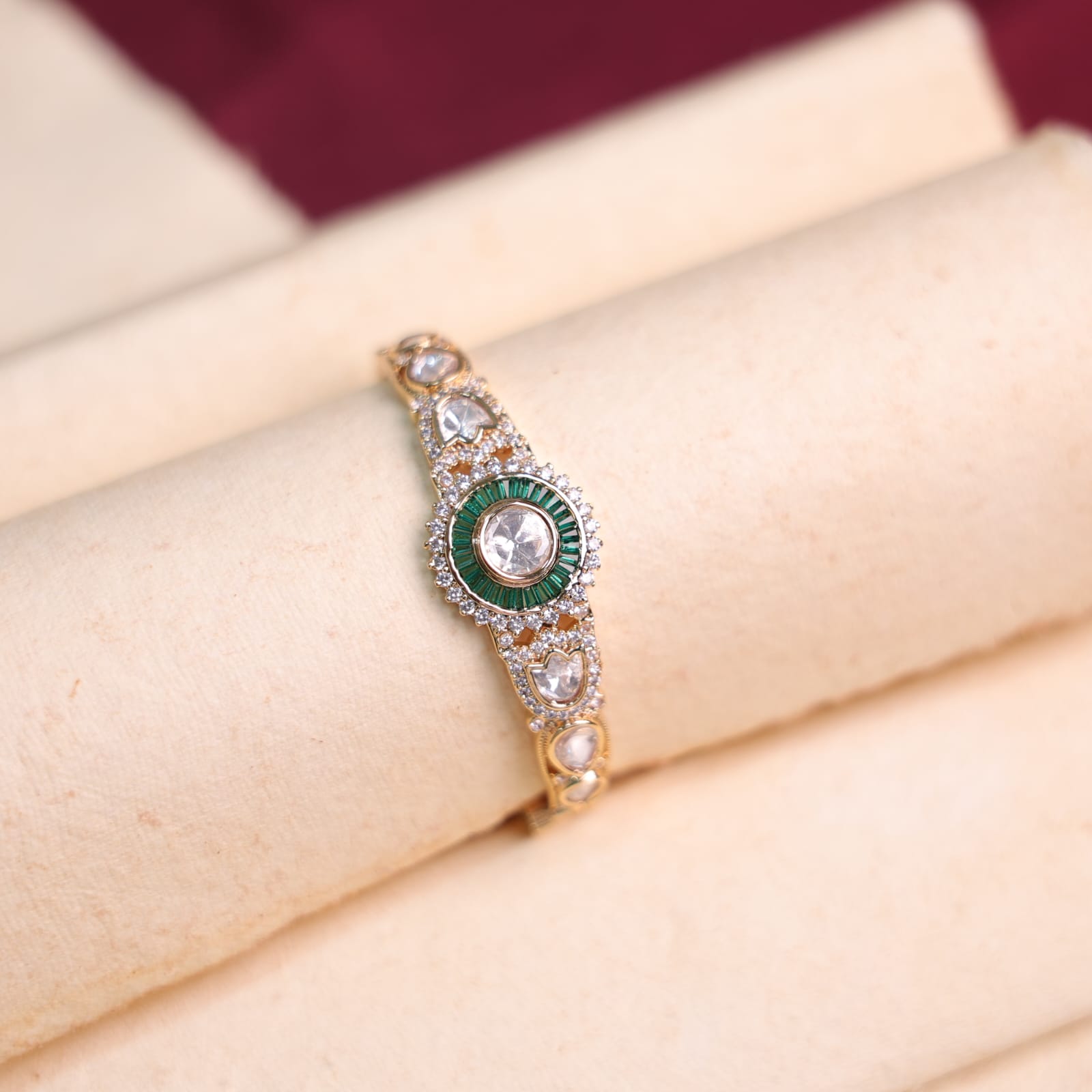 The Vrinda Moissanite Bracelet combines exceptional craftsmanship with timeless elegance. Featuring brilliant moissanite and AD stones set in 18K gold polish, this piece delivers diamond-like sparkle with remarkable durability. Its versatile design seamlessly complements any wardrobe, from casual everyday wear to formal occasions. The lustrous gold finish enhances the stones' radiance, creating a sophisticated accessory that catches light beautifully. Perfect for those seeking luxury appeal with practical everyday wearability