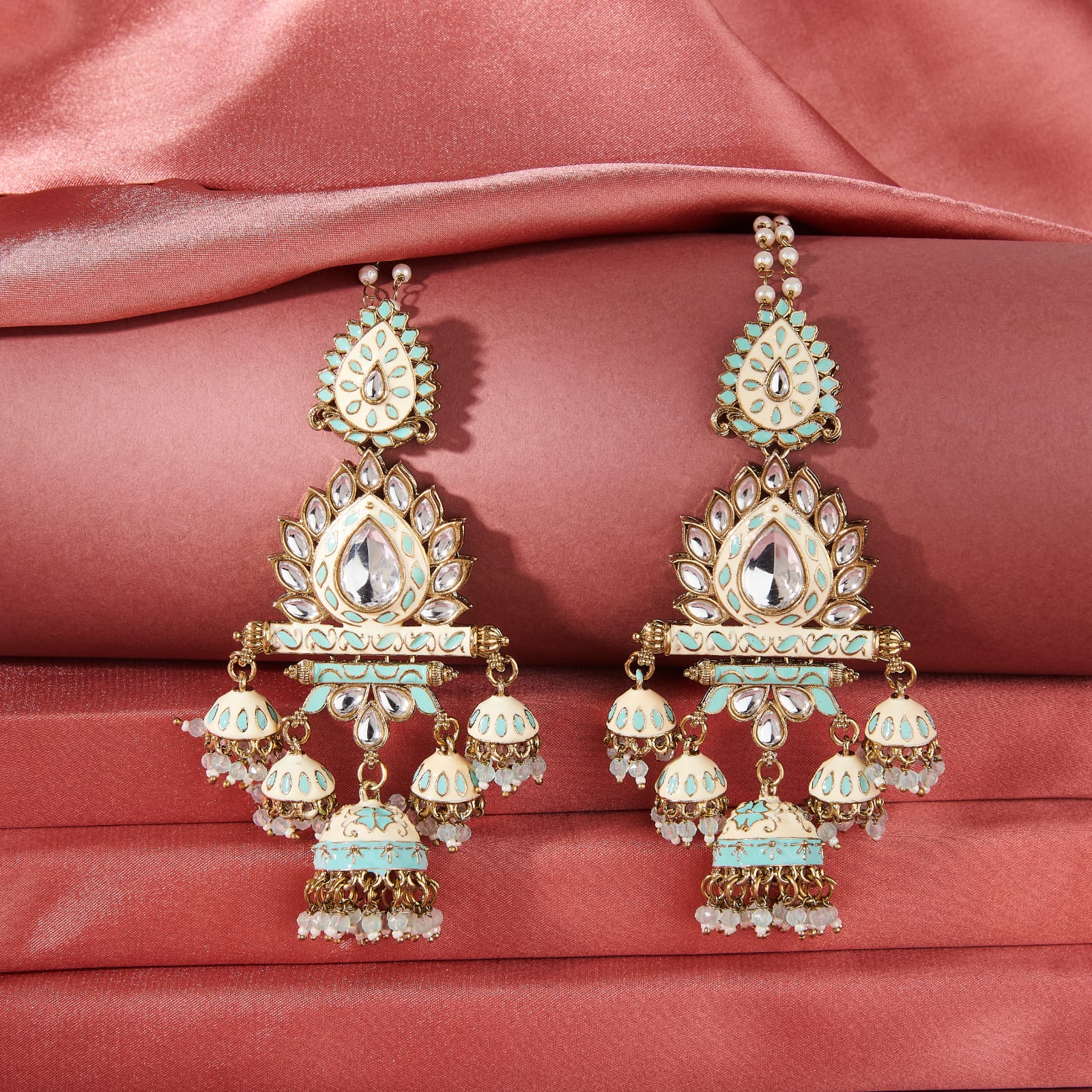 Introducing the BHAVNA KUNDAN EARRING, a rare design with multiple small jhumkas in one. The statement piece features eye-catching Bollywood-inspired detailing and light blue enamel work, perfect for any special occasion. Elevate your look and stand out with these long, intricately-crafted earrings.