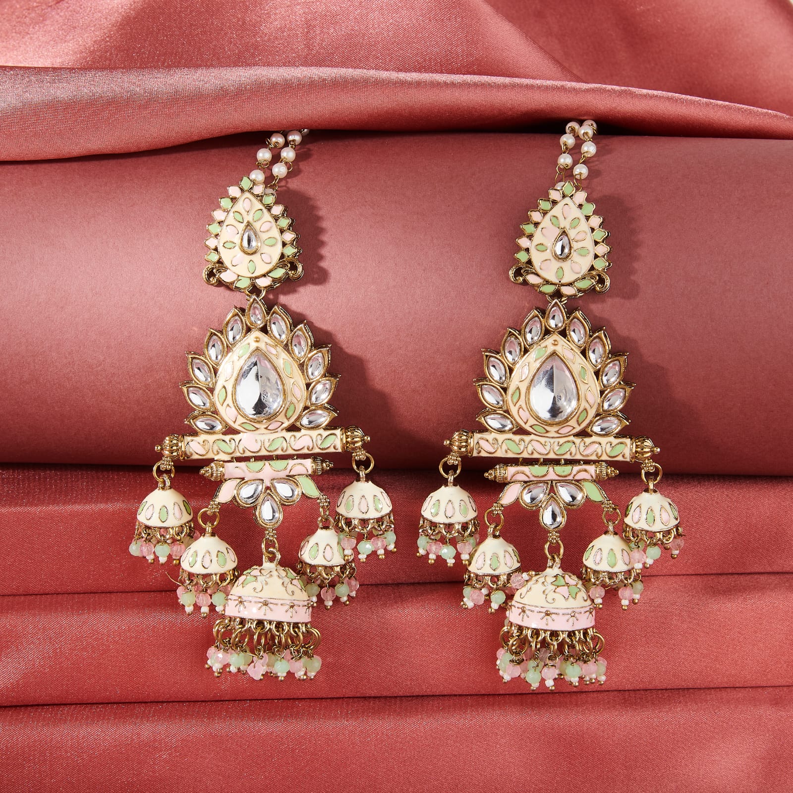Introducing the BHAVNA KUNDAN EARRING, a rare design with multiple small jhumkas in one. The statement piece features eye-catching Bollywood-inspired detailing and pista green and baby pink enamel work, perfect for any special occasion. Elevate your look and stand out with these long, intricately-crafted earrings.
