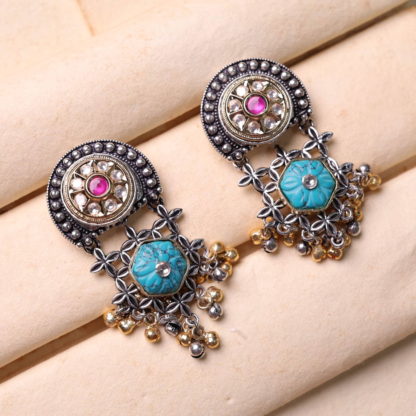 Dhara Fusion Danglers blend traditional craftsmanship with contemporary style, featuring delicate pachi kundan detailing and an oxidized finish. These lightweight earrings offer elegance without compromising comfort, making them ideal for both everyday wear and special occasions. Their sophisticated design adds a refined touch to any outfit while ensuring ease of use throughout the day.