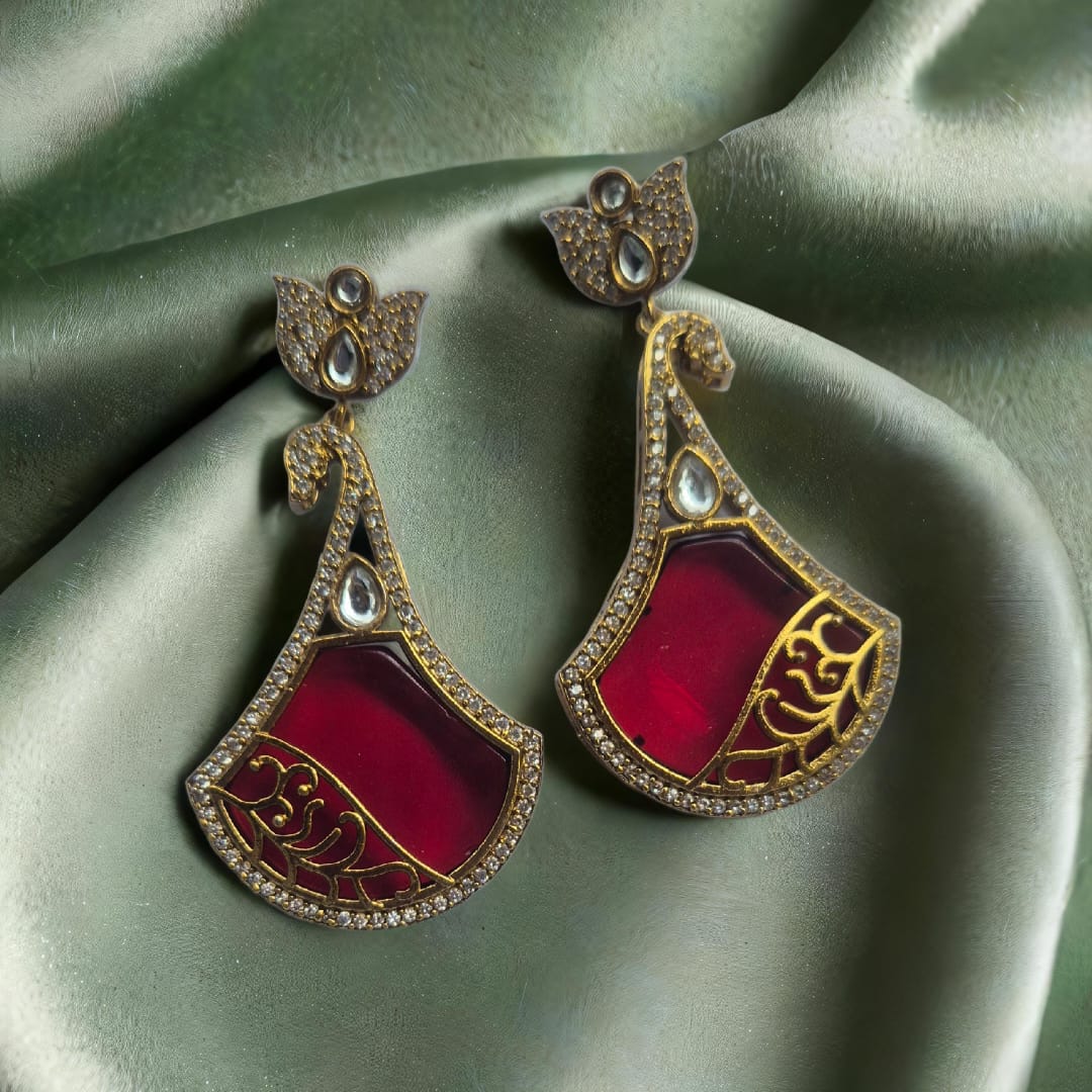 Expertly crafted JALSA earrings feature a unique design with stunning red stones, CZ stones, and kundan, all accented by a luxurious gold polish. Stand out at parties with these eye-catching earrings that exude elegance and style.