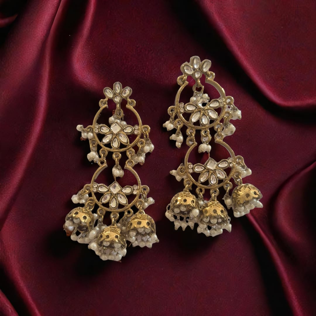 Experience elegance with our MEETA KUNDAN AND PEARL BALI. Traditionally adorned with small white pearls, these earrings exude simplicity and beauty. Perfect for any occasion, these bali style  also feature a mini jumka for an added touch. Elevate your style with these stunning earrings.
