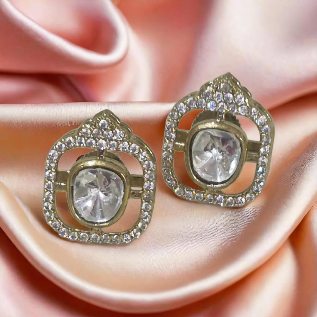 Experience the perfect blend of elegance and trend with our Pinky Mossanite Studs with CZ. Featuring a single stud adorned with a CZ jacket, these studs provide a regal touch with their trending mehendi polish. Get a sparkling shine every day with these exquisite earrings. Dimensions Earring Length: 0.8 inches, Width: 0.7 inches, Weight: 7.79 g