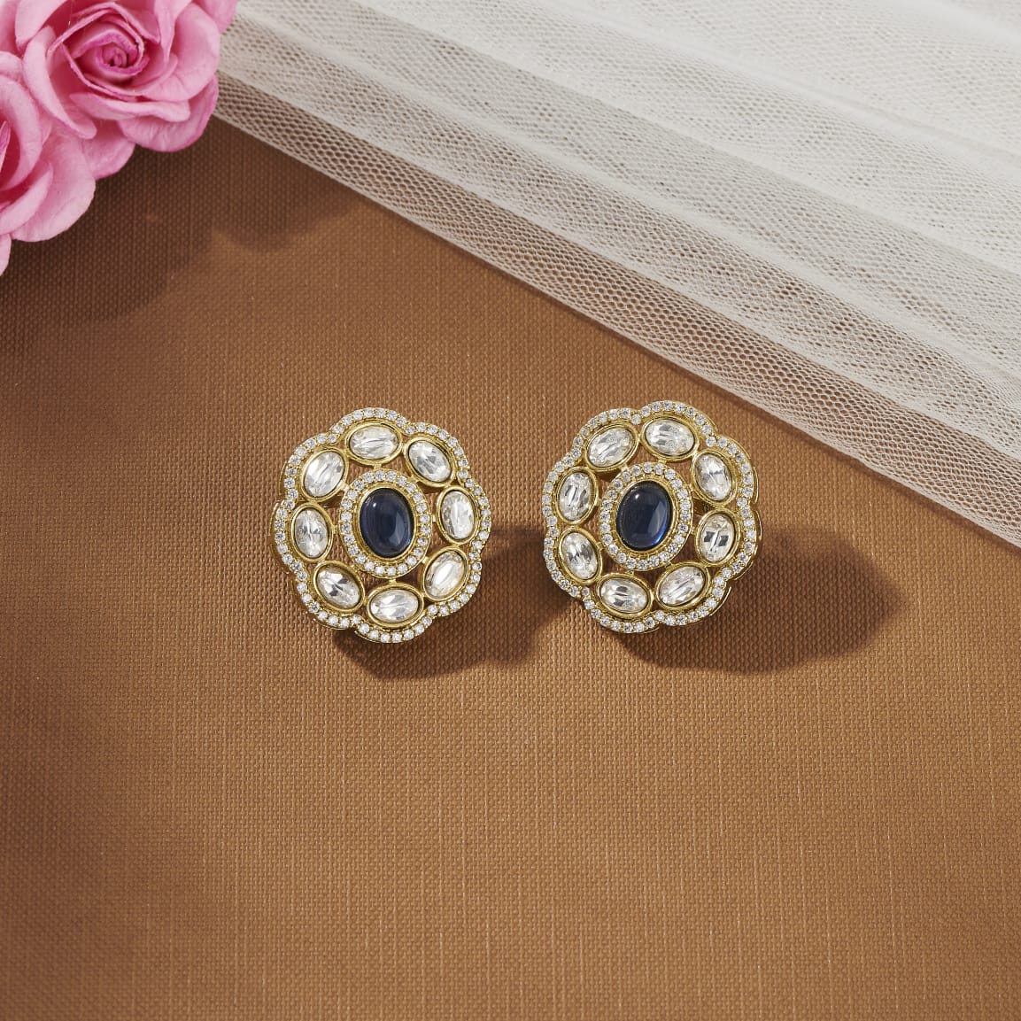 Introducing our Priyanka kundan Studs, adorned with a striking CZ stone outline and a stunning blue stone center for a regal touch. These earrings are perfect for any occasion, adding elegance and sophistication to any outfit. Make a statement with these luxurious studs Dimensions Earrings Length: 1.25 inches, Width:1 inch, WeighT:14.90 G