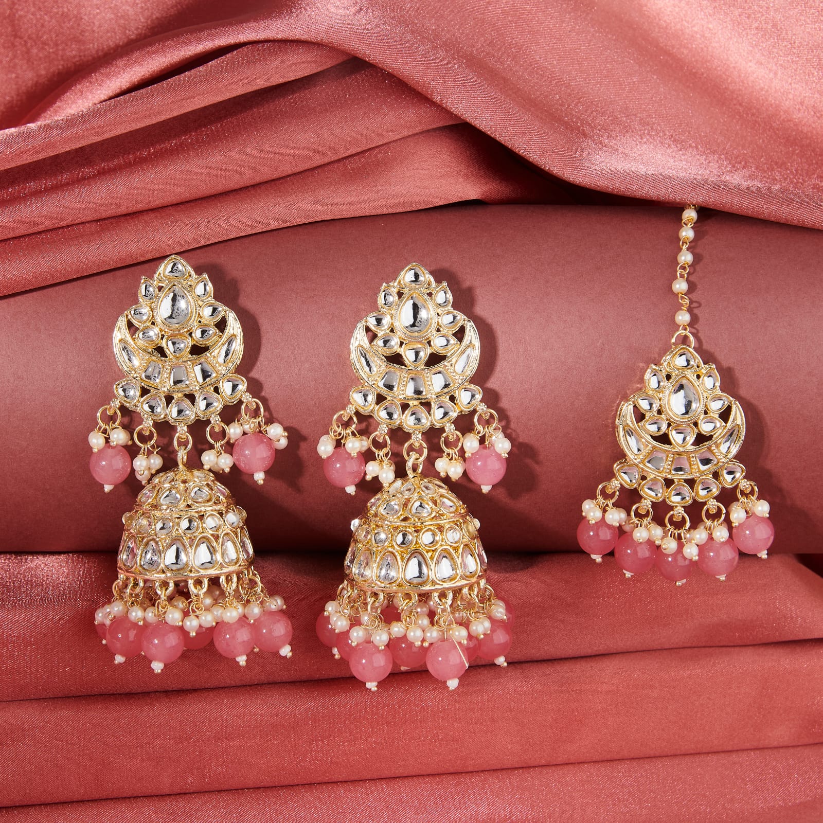 SNEHA KUNDAN EARRING & MANG TIKA WITH BABY PINK PEARLS