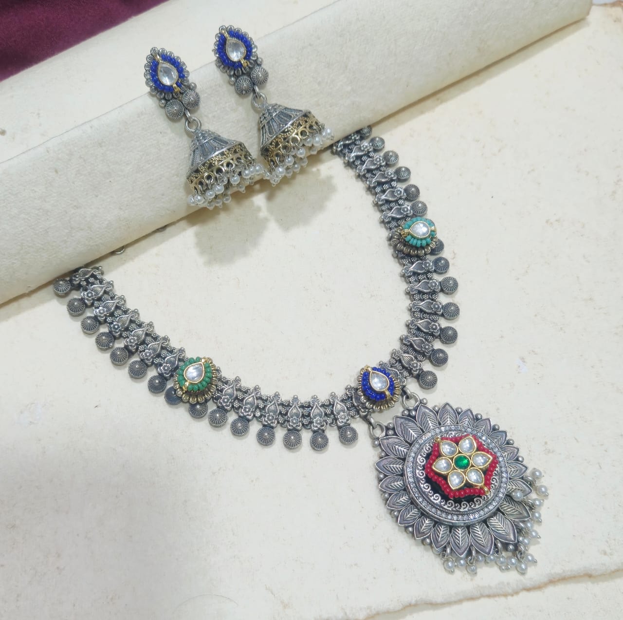 Experience the exquisite craftsmanship of the Monalisa German Silver Fusion Set, featuring intricate paachi kundan work that highlights traditional artistry. This masterpiece complements all traditional outfits with its elegant design, enhanced by matching jhumka earrings that complete the look with grace and sophistication. Ideal for festive occasions and cultural events, this set offers a refined blend of heritage and modern style.