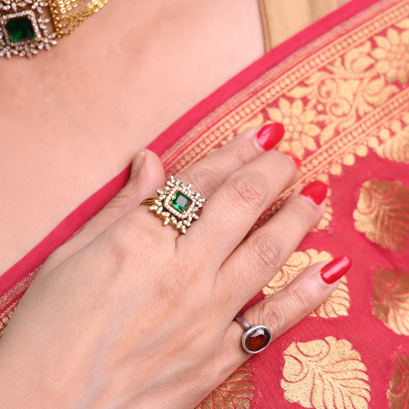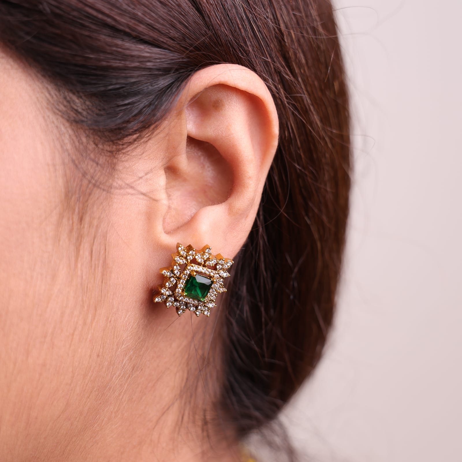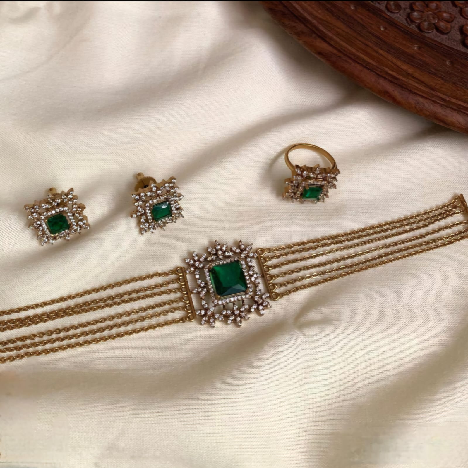 Introducing the Aisha Green Emerald Choker Set—a sophisticated ensemble crafted for the discerning jewellery connoisseur. This minimalist masterpiece features a stunning emerald green stone as its focal point, complemented by intricate stone work and lustrous golden chains that exude timeless elegance. The set includes a matching ring and earrings, creating a cohesive collection that transitions seamlessly from everyday wear to special occasions. Each piece reflects refined craftsmanship and understated luxury, making it an essential addition to any jewellery collection.