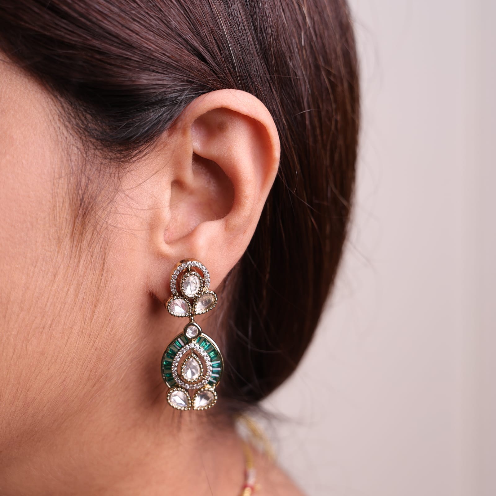 Introducing the Girika Moissanite Set—a regal ensemble that captures timeless elegance. This exclusive design features brilliant moissanite complemented by striking green baguette stones, finished with intricate Victorian polish that exudes sophistication. The set includes a stunning centerpiece paired with matching earrings and a traditional maang tikka, creating a complete bridal or occasion look. Each piece reflects meticulous craftsmanship and refined artistry, making it an exceptional choice for those who appreciate luxury and heritage-inspired design.
