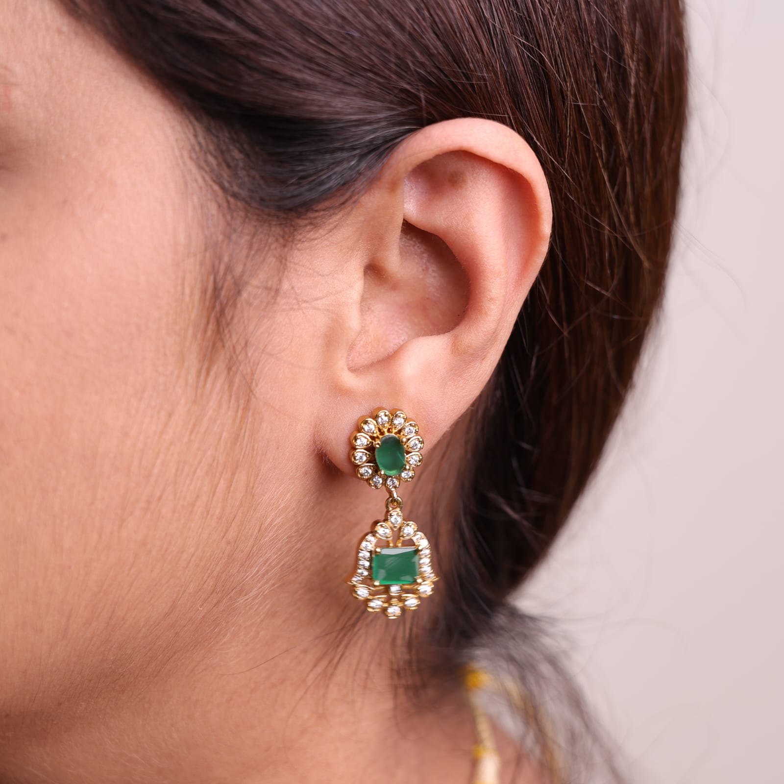 Introducing the Giriyo Elephant Set in emerald green—a regal ensemble that captures timeless elegance. This showstopper features intricate elephant motifs adorned with lush green stones and lustrous pearls, creating a mesmerizing interplay of tradition and sophistication. The matching earrings complete the coordinated look, making it an ideal choice for those seeking authentic grandeur. Perfect for weddings, festivals, and special occasions, this set imparts a distinctly royal aesthetic that elevates any traditional ensemble with understated opulence.