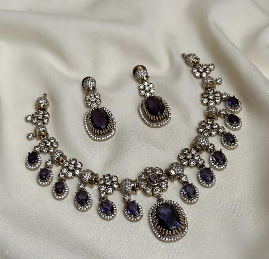 Step into royalty with MERARI JEWELLERY'S meticulously crafted Victorian Kundan set, adorned with radiant purple stones and sparkling CZs. Finished with matching earrings, it's a graceful statement for any grand occasion.