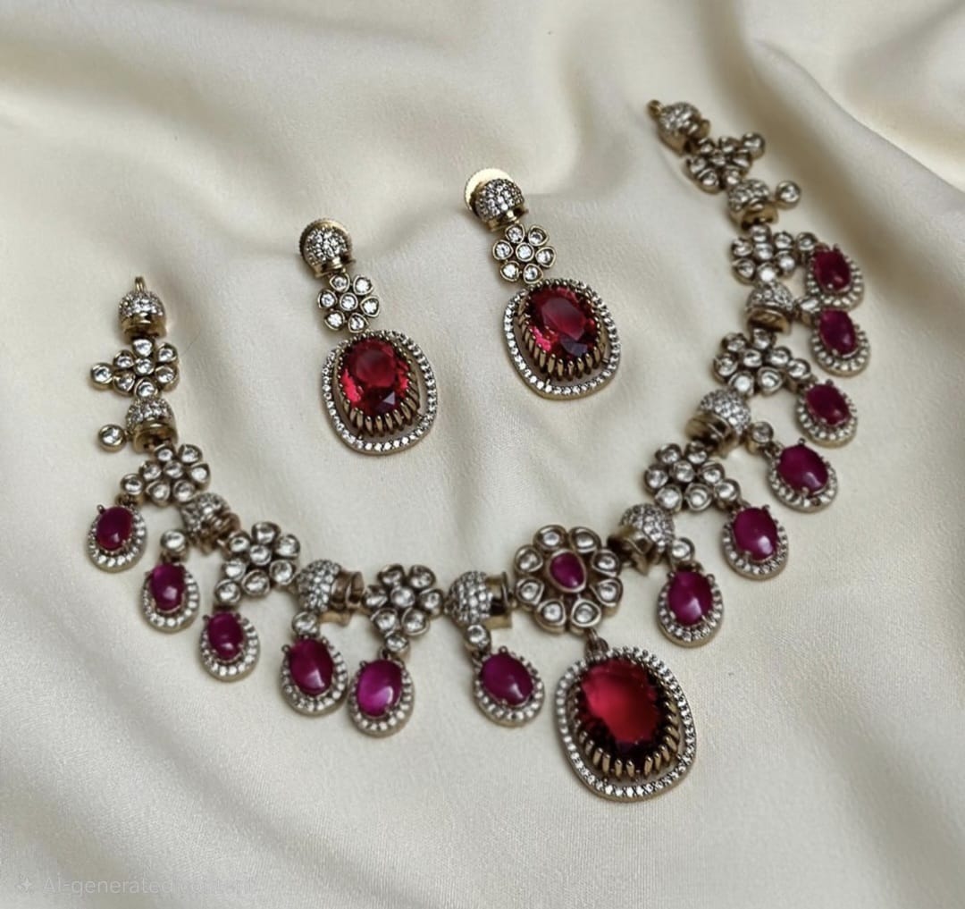 Step into royalty with MERARI JEWELLERY'S meticulously crafted Victorian Kundan set, adorned with radiant ruby red stones and sparkling CZs. Finished with matching earrings, it's a graceful statement for any grand occasion.