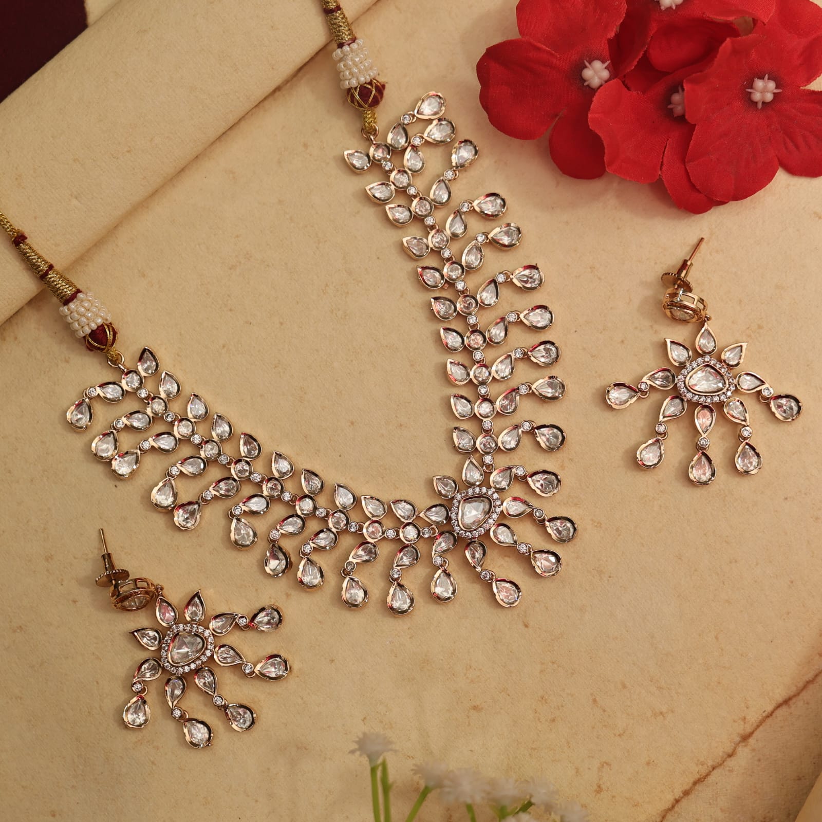 The Simran Moissanite Jewellery Set is expertly crafted with dazzling moissanite stones and includes matching earrings. Finished with an 18KT gold polish, this set is ideal for enhancing your look at all traditional occasions, combining timeless elegance with exceptional quality.