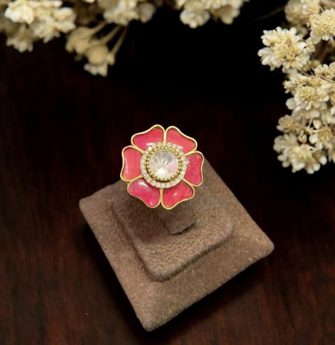 The Reshma Moissanite Ring showcases expert craftsmanship with its stunning flower design, featuring a sparkling moissanite centerpiece. Adorned with delicate pink meenakari on each petal, this ring beautifully blends traditional artistry with modern elegance, making it a versatile accessory that complements both traditional and Western outfits effortlessly.
