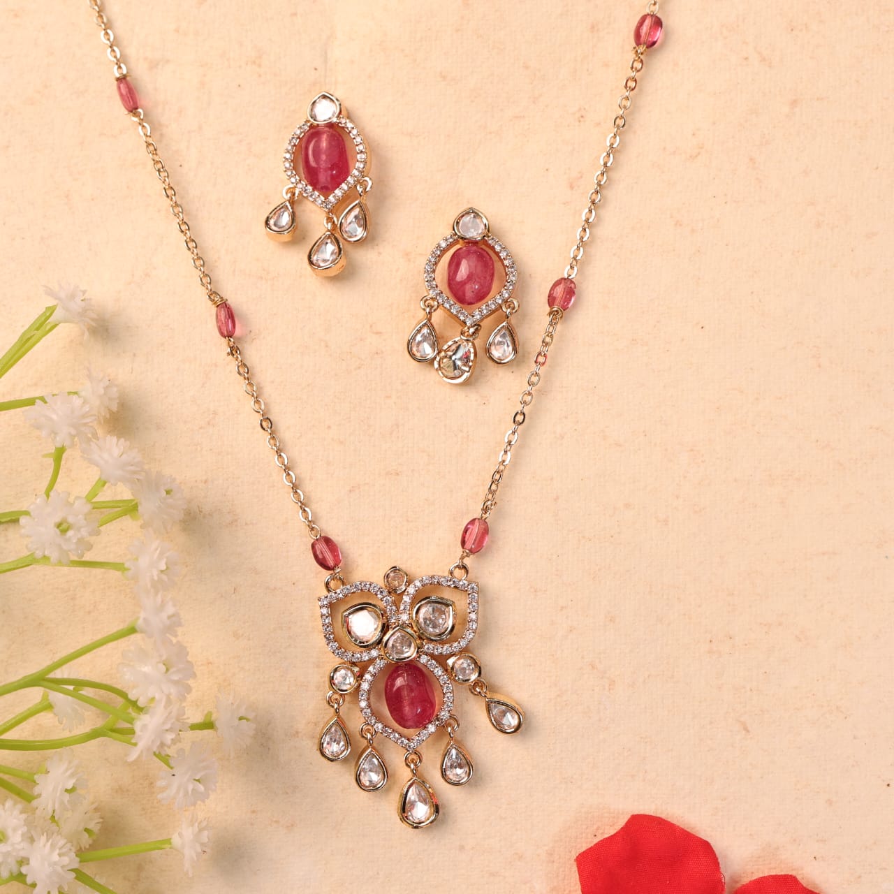 Elevate your elegance with the Alanka Moissanite Pendant Set, featuring a dazzling moissanite pendant paired with matching dangling earrings. Accented by delicate pink stones and beads, this exquisite set offers a refined blend of sparkle and subtle color. Perfect for special occasions, it promises to capture attention and enhance your sophisticated style effortlessly.