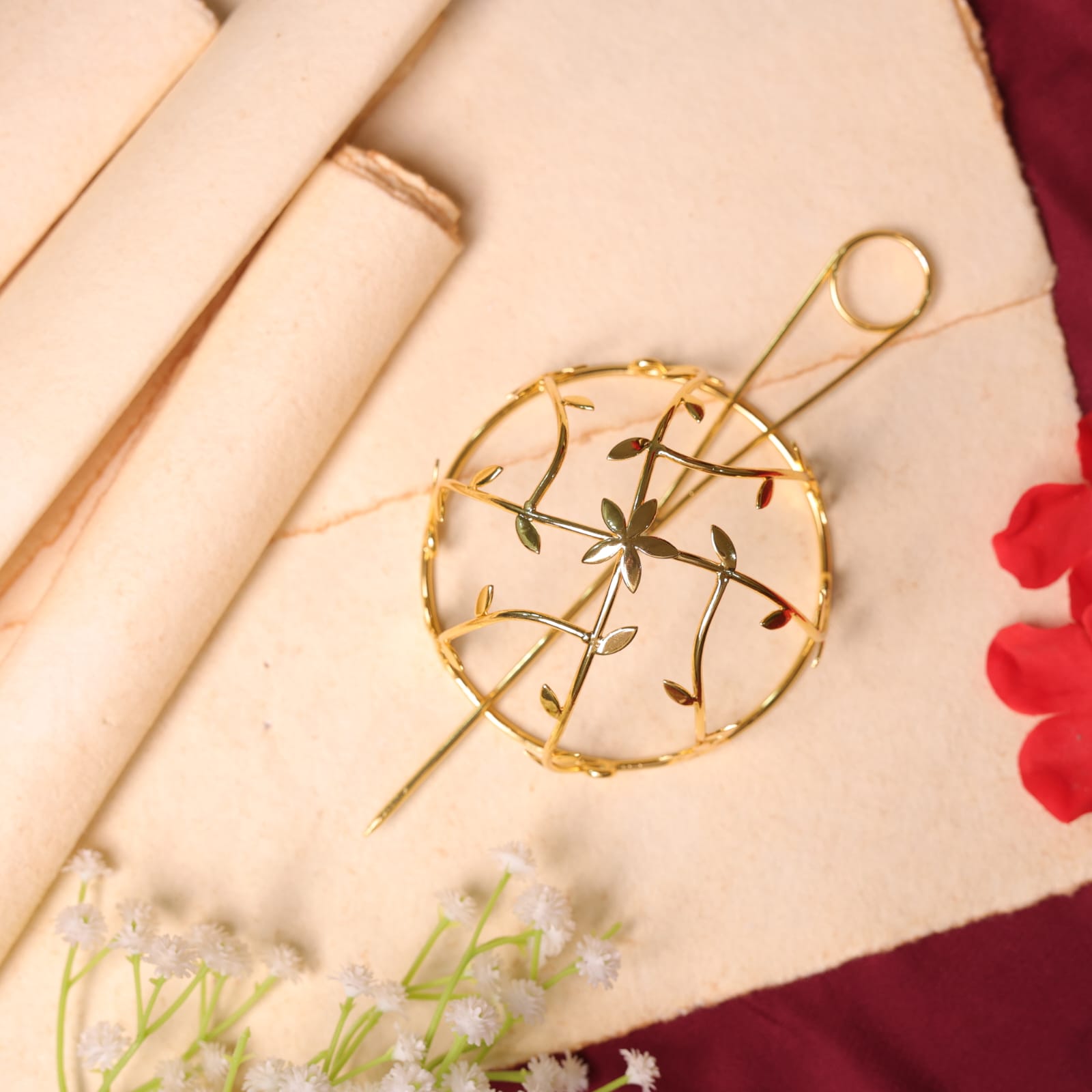 An eye-catching hair accessory that effortlessly captures attention. This show-stopper piece adds a statement touch to both traditional and Indo-Western outfits, making it a must-have for any special occasion. Dimensions Diameter: 3.5 inches    Depth:2.5 inches     Weight:42 g