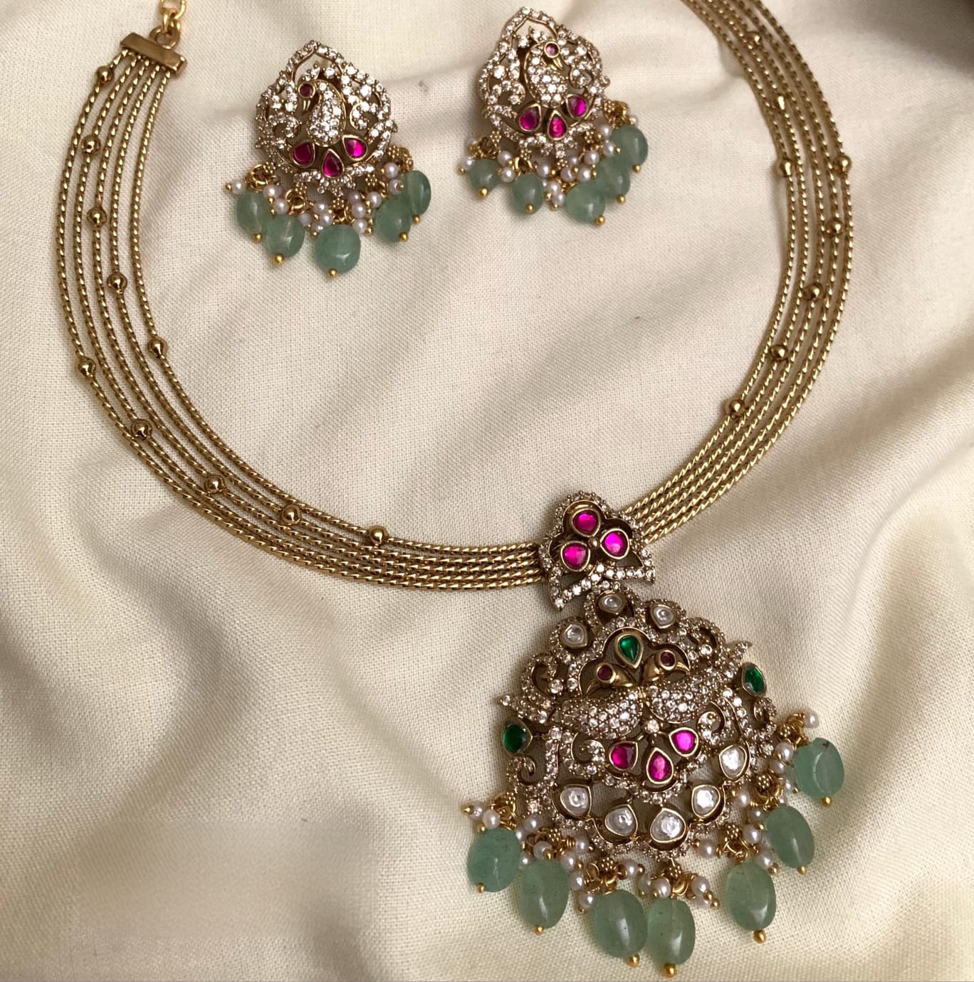 The Meenakshi Moor Set showcases expert craftsmanship with its striking ruby red stones paired with vibrant green beads. This exquisite design features additional motifs that enhance its overall elegance, making it an ideal accessory to elevate your festive attire with a refined and traditional touch.