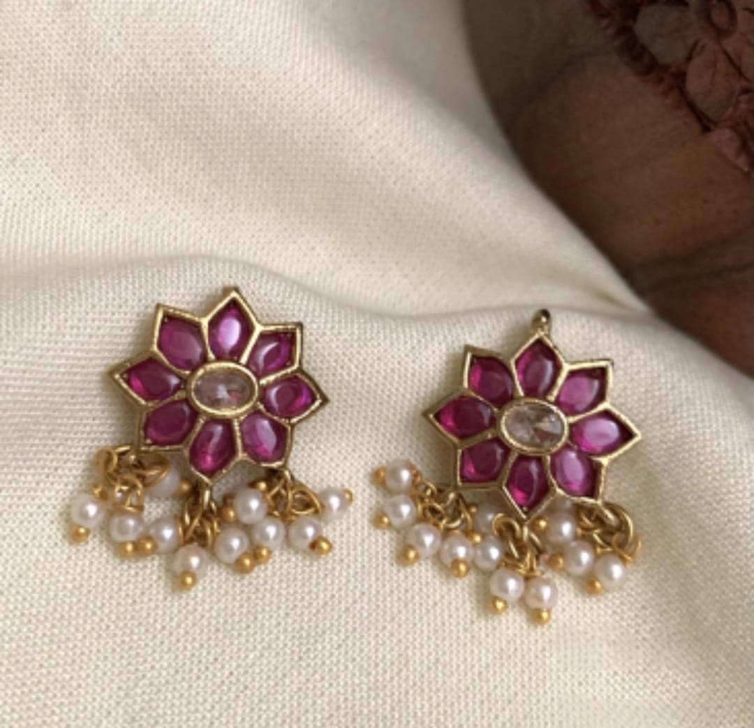 Elevate your traditional ensemble with the Meghna Bugadi Earrings, designed to impress without the need for piercings. Featuring a captivating flower shape embellished with pearl danglers and ruby stones, these earrings blend elegance with cultural charm. The intricate floral detail adds a delicate touch, making them an eye-catching accessory that commands attention at every occasion. Perfect for those seeking a blend of timeless design and comfort.