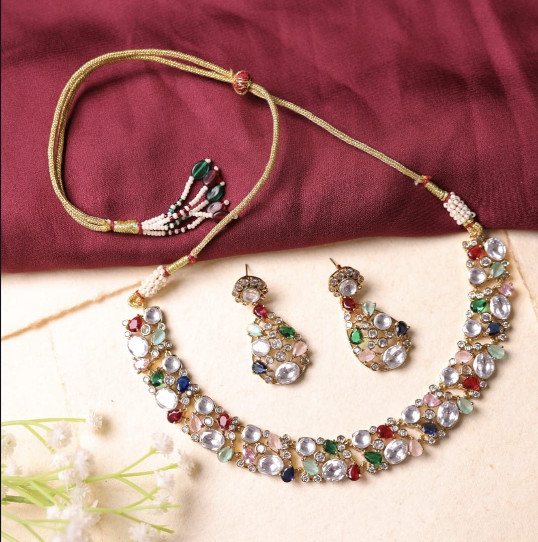 The Meghna Multicolour Set showcases exquisite craftsmanship with its beautifully crafted kundan work and vibrant multi-colour stones, making it an ideal choice for festive occasions. This elegant set includes matching long earrings that perfectly complement the necklace, enhancing your overall look with traditional charm and sophistication.