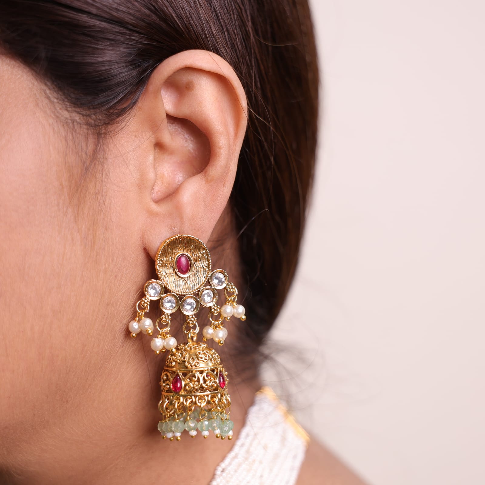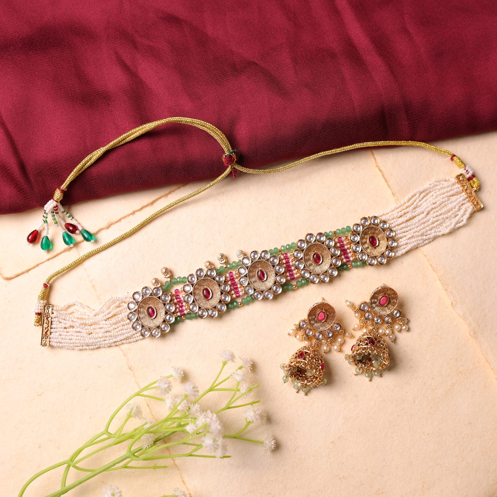 Elevate your traditional attire with the Mitali Rajwadi Set, featuring a gracefully designed choker adorned with green and white beads. Golden floral motifs embellish the piece, adding a regal charm that evokes timeless elegance. Complete with matching jhumka earrings, this set perfectly complements any ethnic ensemble, ensuring you exude a sophisticated royal aura at every occasion.
