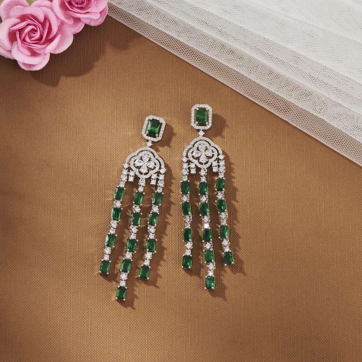 These PREETY STUNNING ZIRCONIA & EMERALD GREEN STONE DANGLERS will dazzle all with their sparkling beauty. Perfect for special occasions, these earrings are sure to catch the eye and make a statement. The combination of zirconia and Emerald green stone creates an amazing and striking look, making them the perfect addition to any party wear.