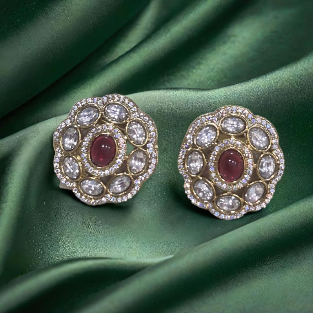 Introducing our Priyanka kundan Studs, adorned with a striking CZ stone outline and a stunning green stone center for a regal touch. These earrings are perfect for any occasion, adding elegance and sophistication to any outfit. Make a statement with these luxurious studs Dimensions Earrings Length: 1.25 inches, Width:1 inch, WeighT:14.90 G