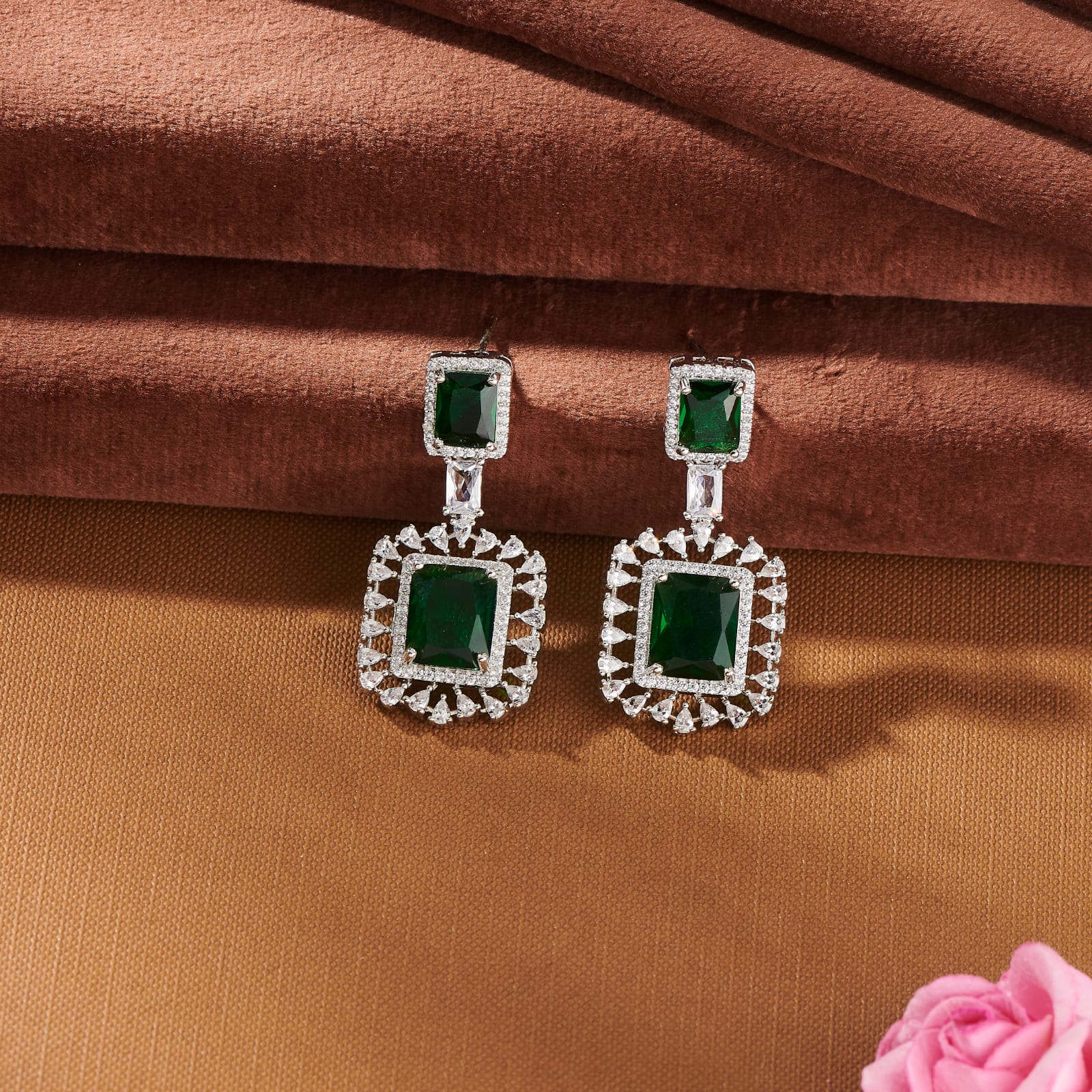 Elevate your style with our Ruchi zirconia earrings. Featuring an evergreen design with American diamond stones and a vibrant green emerald, these earrings symbolize luxury and are perfect for any occasion. Their luminous shine will add a touch of glam to any outfit.