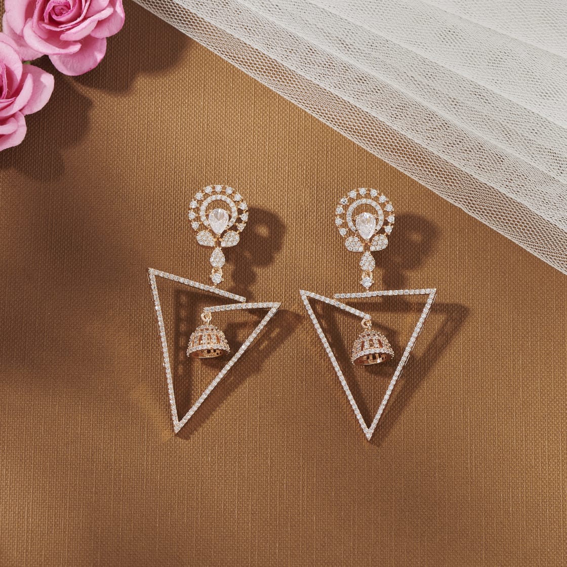Elevate your style with our TRICONE ZIRCONIA WITH MINI CENTRE JUMKA EARRINGS. Featuring triangle-shaped ZIRCONIA gems and dangling mini JUMKAS, these Indo-Western earrings add an eye-catching and cute touch to any outfit. Perfect for those looking for a unique, modern twist on traditional CUM Western earrings.