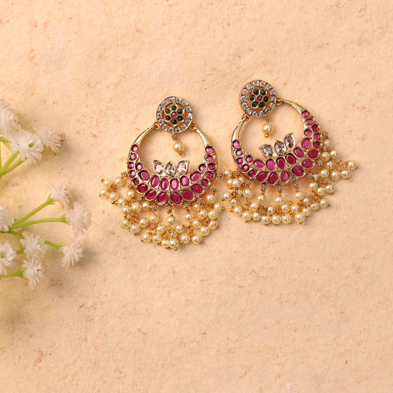 Elevate your traditional look with the Vrinda Kemp Chandbali, featuring a captivating blend of ruby red and green stones set in radiant 18kt gold with a luminous polish. The intricate design is enhanced by delicate pearl danglings, adding graceful movement and timeless elegance. Perfectly crafted for those who appreciate expert artistry in classic Indian jewelry.